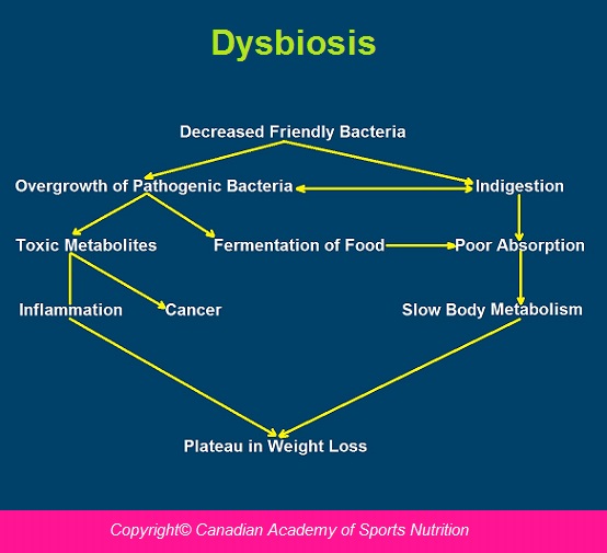 Dysbiosis is disruption of normal flora of the intestines. It is the imbalance between good and bad bacteria of the intestine. Dysbiosis has been linked with obesity, chronic fatigue syndrome, inflammatory bowel disease, weak immune system, and cancers.